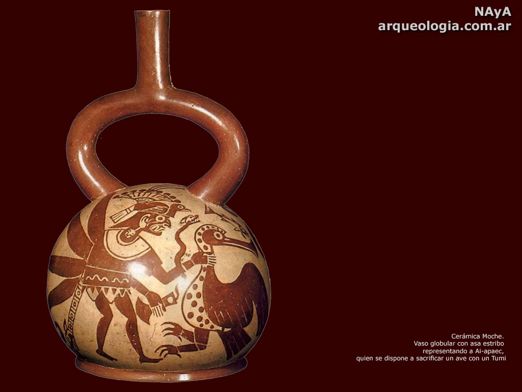 ![]() 800x600 - - - 1024x760 Cerámica Moche. vaso globular con asa estribo representando a Ai-apaec, quien se dispone a sacrificar un ave con un Tumi |